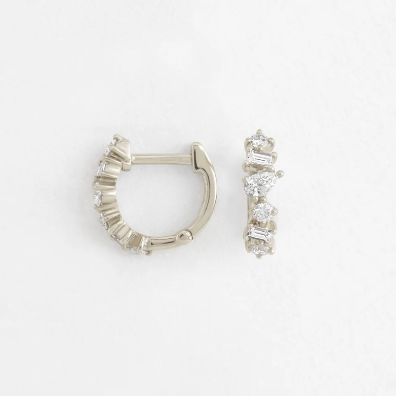 Add sparkle and sophistication to your ear stack with these 14k Gold Mixed Shape Diamond Huggie Earrings. Crafted in solid 14k yellow gold, each hoop is set with a unique mix of pear, round, and emerald cut natural diamonds totaling approximately 0.27ctw.