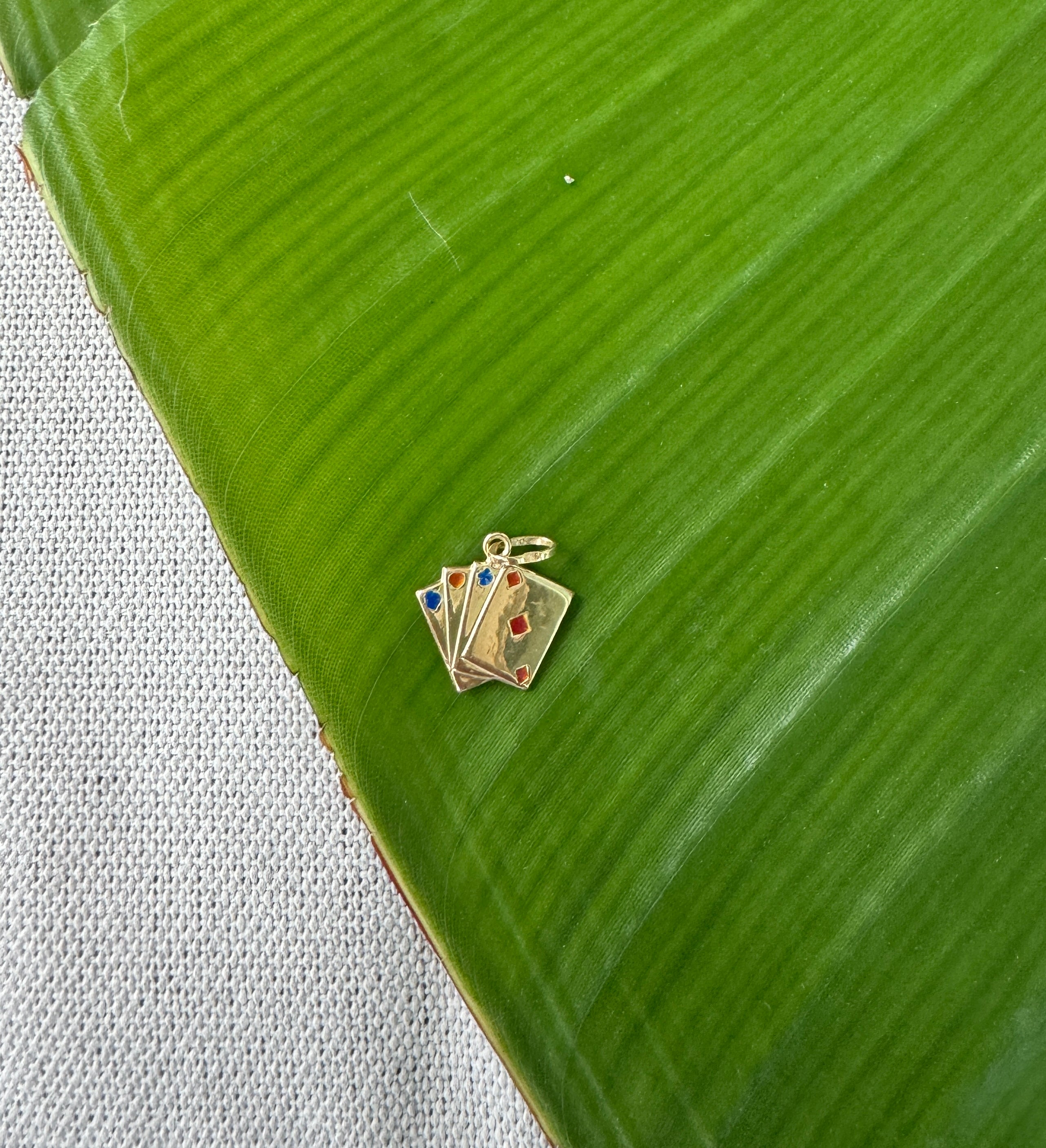 This 14K Solid Gold Vintage Playing Cards Pendant is a fun and unique addition to any jewelry collection. Featuring a detailed playing cards design with intact enamel, this pendant adds a touch of whimsy to any outfit. Personalize it! Wear it alone for a bold, classic, minimalistic vibe or layer and stack with dainty to statement jewelry with diamonds and gemstones for a custom look.